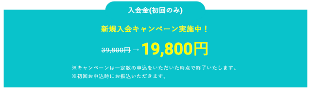2021年現在では新規入会キャンペーンにより、入会金が39,800円⇒19,800円に割引されます。