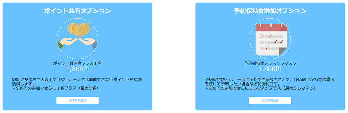 ポイント共有オプションは上記で解説した家族共有のシステム、予約保持数増加オプションは一度に予約できるレッスン数の増加です。